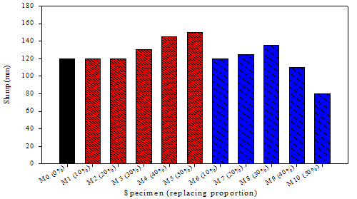The results of slump tests are shown in Figure 7. When sand (fine aggregate) was replaced by fine rubber particle at the low proportions (10% and 20% by volume), it can be seen that the slumps or workability of fresh rubberized concrete were not changed much compared to that of the control mix (M0). At the higher replacing proportions (30%, 40% and 50% by volume), the slumps relatively increased. Our results are in good agreement with the slump test results reported by previous studies (Balaha et al., 2007; Azmi et al., 2008; Aiello and Leuzzi, 2010; Pelisser et al., 2012; Onuaguluchi and Panesar, 2014; Elchalakani, 2015) where the workability of fresh rubberized concrete increased with increasing rubber contents. For instances, Aiello and Leuzzi (2010) showed that the workability of rubberized concrete was slightly improved when coarse or fine aggregates were partially replaced with rubber shreds. They reported that the control concrete exhibited a fluid behavior, while the rubberized concrete showed a hyper-fluid behavior. Similarly, Balaha et al. (2007) used ground waste tyre rubber for partial replacement of natural sand at the proportions of 0%, 5%, 10%, 15% and 20%, by volume and they reported that the workability increased as rubber sand content increased. However, it is worth to note that a number of studies reported contrary results with the decreased workability with the inclusion of rubber aggregates in the concrete mixture (Güneyisi, 2010; Ozbay et al., 2011; Raj et al., 2011; Karahan et al., 2012; Rahman et al., 2012; Dong et al., 2013; Ganesan et al., 2013; Grdić et al., 2014; Holmes et al., 2014; Mohammadi et al., 2014)