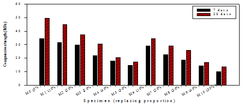 The 7-day and 28-day compressive strengths as a function of different replacing proportions of rubber particles with different sizes are presented in Figure 8. As expected, the compressive strength increased with curing time for the control specimen (M0) and other specimens (M1-M10) at all replacing proportions. The compressive strength of the control specimen was evaluated as 34.5 and 49.5 MPa at 7 and 28 days, respectively. The test results indicated that there was a significant reduction in the compressive strength of the rubberized concrete as the rubber content increased in comparison to that of the control specimen at both 7 and 28 days. It is found that depending on the proportion and size of replacing rubber particles, the degree of reduction in the compressive strength was different (Figure 9). At the replacing proportion of 10%, the reduction in the compressive strength of the specimens containing fine rubber particles at 7 and 28 days were 8.7 and 9.7%, respectively; whilst the counterpart for the specimens containing coarse rubber particles at 7 and 28 days were 16.2 and 30.3%, respectively. This suggests that using coarse rubber particles lowered the compressive strength of the rubberized concrete more than the case of using fine rubber particles. When the replacing proportions increased to 20, 30, and 40% by volume, the compressive strengths also decreased accordingly, however, the degrees of reduction between two cases (the specimens containing fine and coarse rubber particles) at the same replacing proportions gradually became smaller than that at the replacing proportion of 10%, especially for the specimens at the curing time of 28 days. The replacing proportion of 50% caused the largest reductions in the compressive strength of specimens containing fine and coarse rubber particles at both 7 and 28 days. The test results imply that using fine rubber particles, instead of fine natural aggregate, at the low replacing proportion (up to 10%) might not cause the significant effect on the compressive strength of the rubberized concrete. Overall, our results agreed well with the previous studies which reported that the inclusion of increasing rubber contents caused progressive losses in the compressive strength of the rubberized concrete and the replacement of coarse aggregate in the concrete mixture lowered the compressive strength more than that of fine aggregate (Ganjian et al., 2009; Yilmaz and Degirmenci, 2009; Aiello and Leuzzi, 2010; Pelisser et al., 2011; Gesoğlu et al., 2014; Holmes et al., 2014; Youssf et al., 2014).