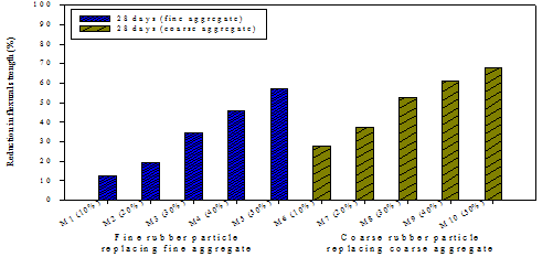 Figure-11. Reduction (%) in flexural strength at 28 days of rubberized concrete compared to plain concrete.