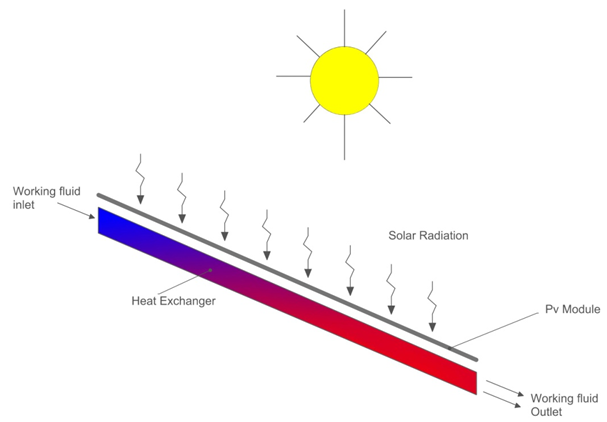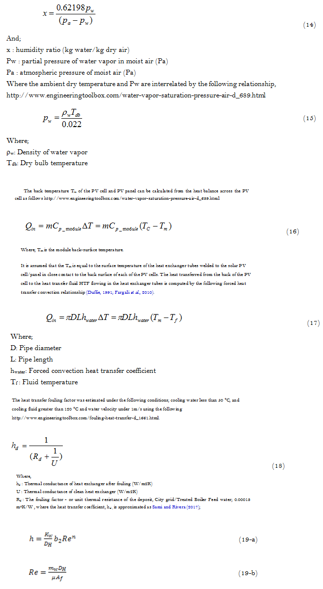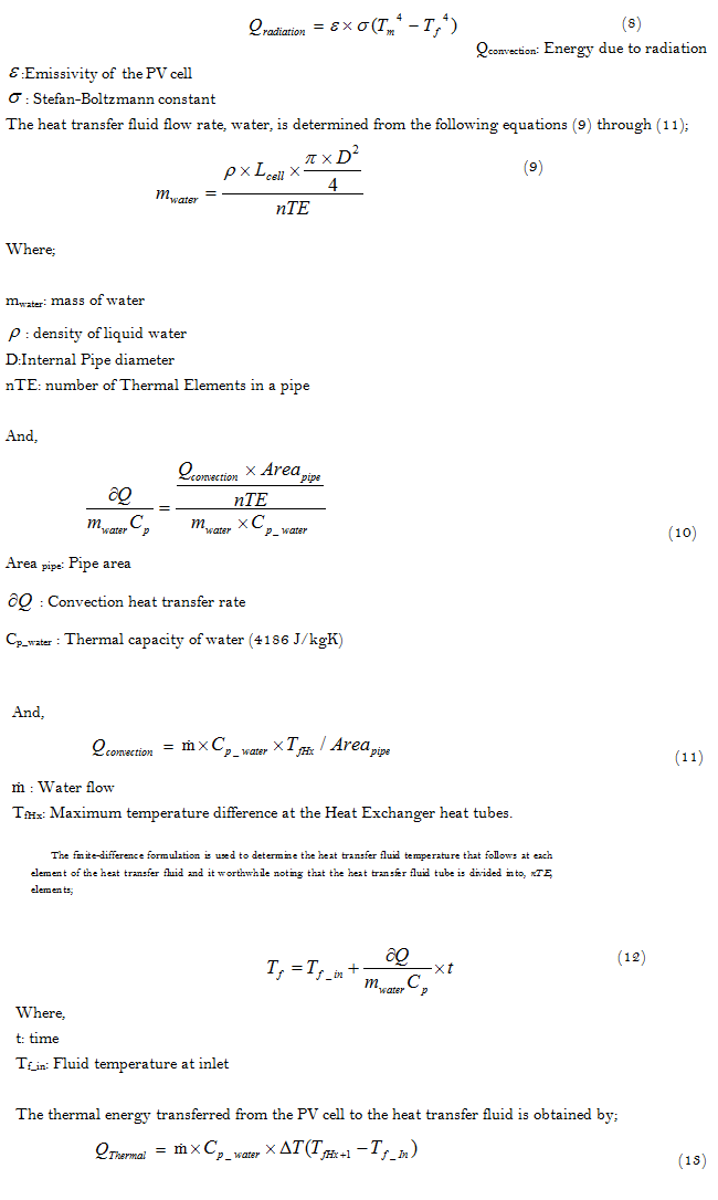 The thermal energy transferred from the PV cell to the Heat Transfer Fluid (HTF) is determined from the heat balance across the PV cell and the heat transfer mechanisms of the HTF, in terms of the conduction, convection and radiation;