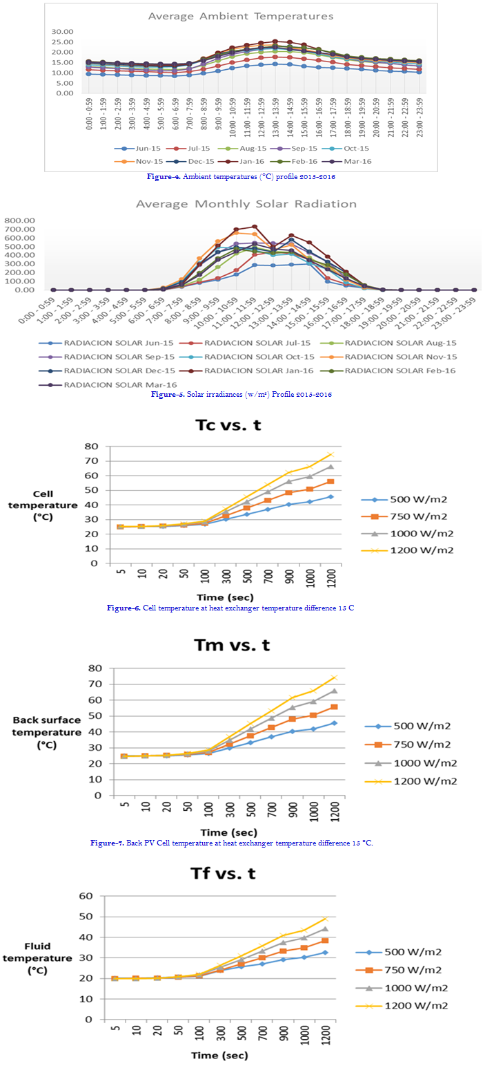 In order to study and analyze the dynamic behavior of the PV cell temperature, back cell temperature as well as the fluid temperature, figures 6 through 8 have been plotted at different solar radiations, constant ambient temperature as well as heat exchanger temperature difference of 15 °C. It is quite evident from the results presented in these figures that the cell temperatures as well as the other ones increase with the increase of solar radiation. This can be interpreted as per equations (1) and (2), where the higher the solar radiations the higher the energy absorbed by the PV cell and consequently the higher the temperature of the cell until reaches the design temperature.