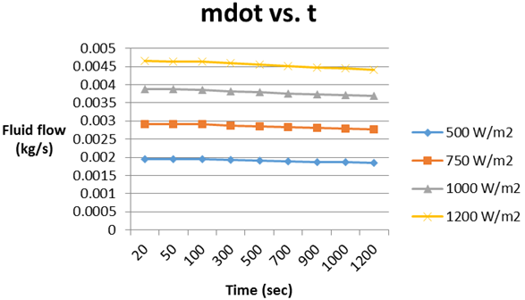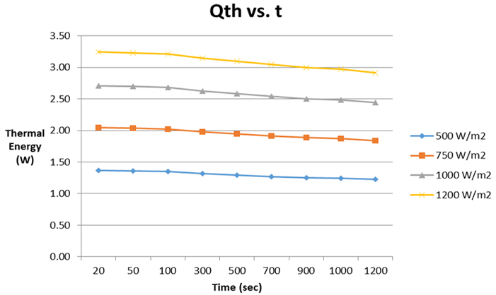 The dynamic behavior of the thermal energy absorbed by the fluid flow flowing beneath the PV solar cell is determined by equations (17) and (18) and plotted in Figure 9 under different solar radiations. The results presented in these figure show that the higher the solar radiations the higher the thermal energy absorbed. The figure also shows that once the cell temperature stabilizes the thermal energy absorbed reaches the steady state level. On the other hand, the results also indicated that the systems stabilized after 1200 second and the desired water flow outlet was reached after this time elapse as shown in Figure.10.