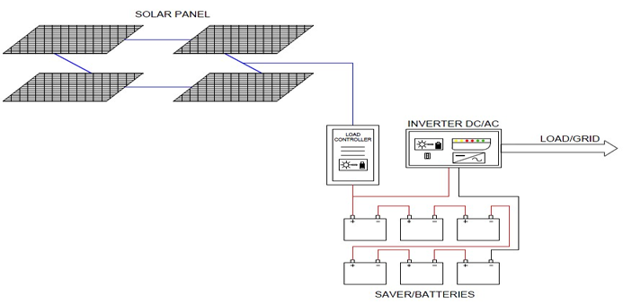 On the other hand, Figure.2 describes the PV basic diagram, where the PV panels output in DC current are connected to the load controller and batteries as well as the inverter for converting the DC current output into AC current for potential use in applications where AC is required.