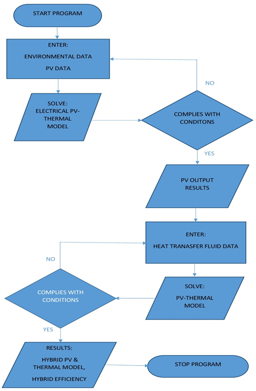 In order to solve the aforementioned equations (1) through (34) and taking into account the heat and mass transfer during the PV solar thermal conversion process, as discussed, the above mentioned equations were coded with finite-difference formulations and solved as per logical flow chart depicted in Figure.3. In addition, for the purpose of validation, the predicted simulated results for PV solar panel were compared to the data published in the literature under various conditions.