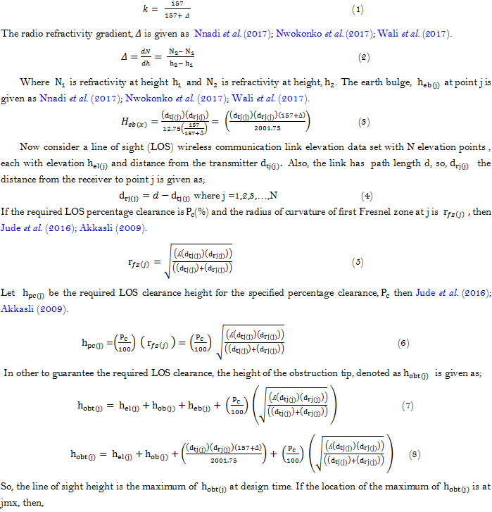 In the determination of earth bulge the effective earth radius K-factor is usually needed, and K is related to refractive index gradient,  as follows Nnadi et al. (2017); Nwokonko et al. (2017); Wali et al. (2017):