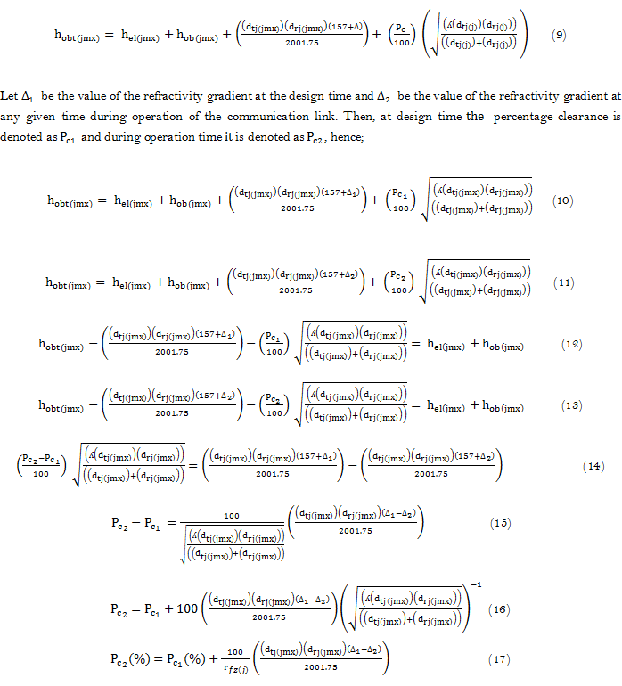 Among other things, the clearance height between the LOS and the obstruction apex depends on a number of the parameters which includes; the frequency of the signal, the distance of the signal from the transmitter, the earth bulge, the elevation profile of the path and the actual height of the obstruction. The earth bulge depends on effective earth radius factor which is a function of the refractivity gradient of the atmosphere (Gunashekar, 2006; Abu-Almal and Al-Ansari, 2010; Ippolito and Ippolito, 2017). As such, even the other parameters are kept constant; the earth bulge can still be affected by changes in the atmospheric refractivity gradient.