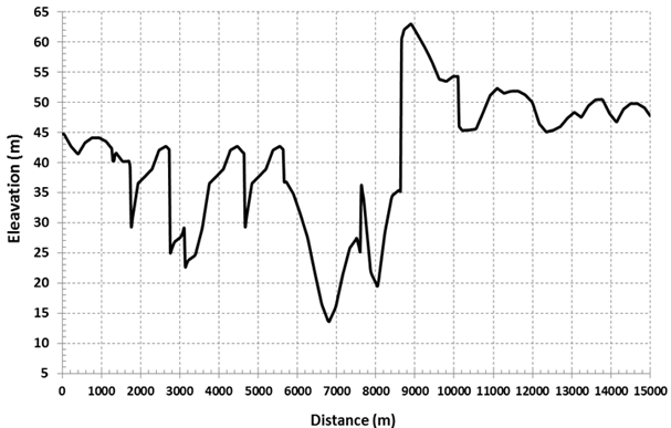 Sample path profile data of terrestrial microwave communication link with 15 Km path length is used in the study to demonstrate the application of the models presented in this paper. The elevation profile plot of the path is shown in Figure 1.  The link was studied at two microwave frequencies, namely, 5.5 GHz C-band frequency and 11 GHz Ku-band frequency. In the link, uniform 10 m obstruction height is assumed along with 60% LOS clearance for the first Fresnel zone. According to the path profile analysis result, the distance from the transmitter to the point of minimum LOS percentage clearance is 8.89Km for both frequencies.