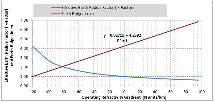 The plot of effective earth radius factor ( k-factor) and earth bulge, in  m versus operating refractivity gradient  (N units/km) at 5.5 GHz and at 11 GHz are shown in Figure 2. The regression equation fitted to the plots are given in Equations 21 and 22;