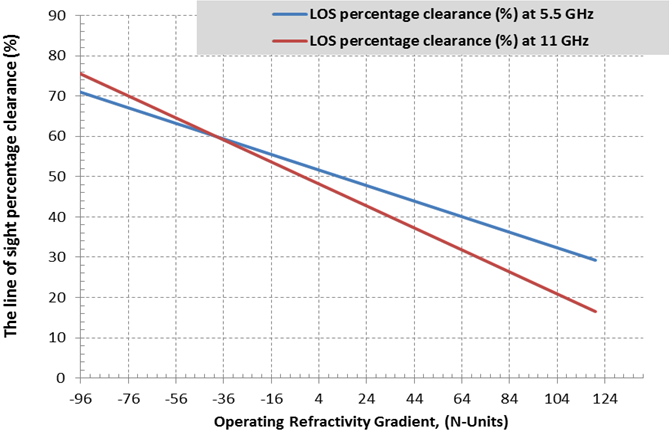 Based on the equations and Figure 2, the LOS percentage clearance decreases linearly with refractivity gradient. As the refractivity gradient increases the LOS percentage clearance decreases but the rate of decrease is faster for higher frequency. Also, for both frequencies, the LOS percentage clearance is the same at the reference refractivity gradient  of -39.25 N units/km which is equivalent to the reference k-factor of 1.33 or 4/3.