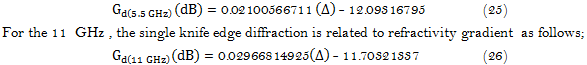 The plot of the single knife edge diffraction versus   refractivity gradient   (N units/km) at 5.5 GHz and at 11 GHz are shown in Figure 4. For the 5.5  GHz , the single knife edge diffraction is related to refractivity gradient  as follows;