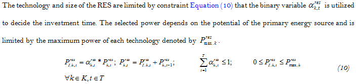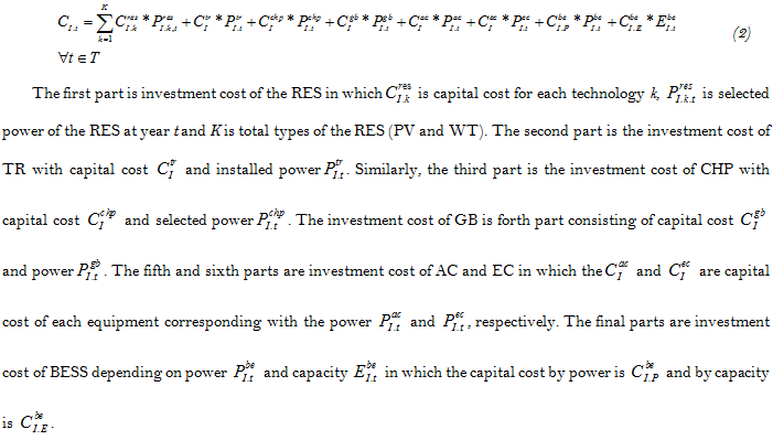 The optimal model consists of an objective function and constraints in which the objective function is minimizing the LCC of the project, the constraints guarantee to make investment decisions and the size limit of equipment together with the operation of EH as following.