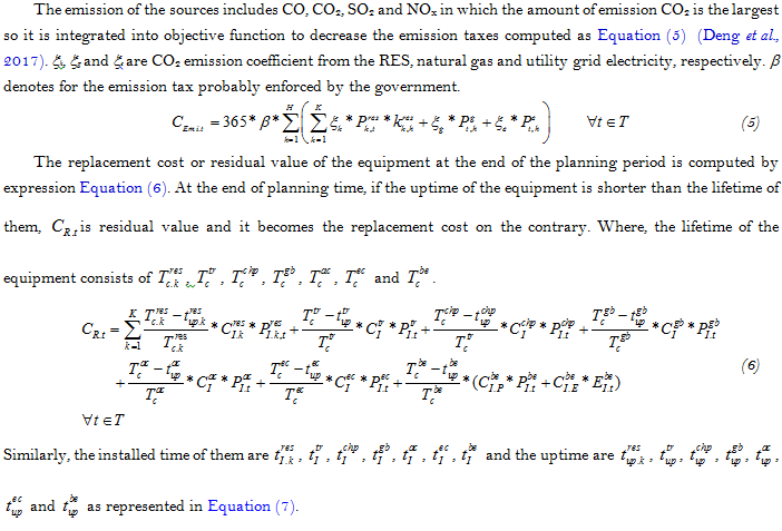 Where, CI.t is the investment cost and COM.t is the O&M of the equipment at year t. CEG.t is the cost of energy purchase (electricity and natural gas) from the market. CEmi.t is emission cost of the sources in the EH and CR.t is replacement cost or residual value of the equipment at the end of the project. r is discount rate and T is total planning time.