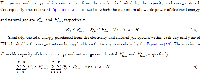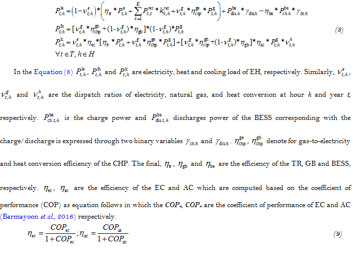 Based on the structure of the proposed EH at Figure 1 and the matrix representing the energy balance relation in Equation (8) the energy balance constraints include three expressions as the following. The first equation balances the electricity, the second equation balances heat, and the cooling is balanced by the third equation.