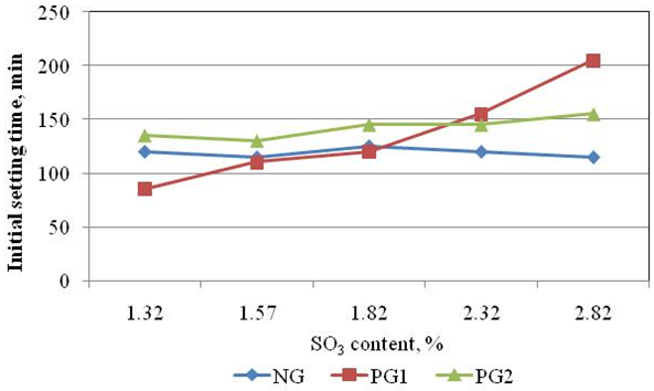 Generally, the setting times of the cement increase when PG content in cement increases. But changing NG content in range of this study does not change both the setting times Table 4 and Figure 2, 3. For PG1, the initial and final setting times of cement containing 3.24% PG1 (1.32% SO3) are 85 and 165 min, clearly shorter than those of cement containing NG and PG2, respectively. However, the setting times of the sample containing 6.9% PG1 (2.82% SO3) increase up to 205 and 310 min, significantly exceed those of the samples containing NG or PG2. The cement containing 3.35% PG2 (1.32% SO3) possesses the initial and final setting times of 135 and 270 min, respectively. When PG2 increases from 3.35% (1.32% SO3) to 7.2% (2.82% SO3), both the setting times of cement increase only 20 minutes Table 4.