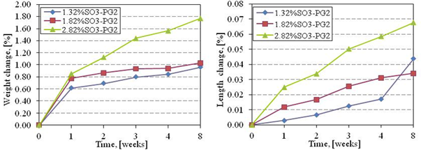 Comparing the results of the samples at the same SO3 content between different gypsums (i.e. NG, PG1 and PG2 in Figure 7 to Figure 9) indicates that there is no significant difference in weight change between the three gypsums. The expansion of the samples containing PG1 is largest Figure 8. The samples containing low contents of NG (i.e. 1.32% and 1.82% SO3) have the length change slightly higher than the samples containing low contents of PG2, respectively. Meanwhile, the length change of the sample containing high content of NG (i.e. 2.82% SO3) is lower than that of the sample containing high content of PG2.