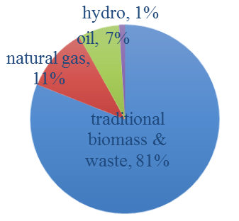 The civil war in the Republic of Congo (1997-1999), has left the country with the damaged of transmission, and transportation of energy infrastructures, especially in Brazzaville, Niari Pool, and Bouenza departments, which has still not been restored yet. The state is looking to extend and re-establish a network of distribution, but until at that point, wood fuel remains preeminent, precisely in rural zones. In Figure 1, we can see that about 80% of primary energy consumption in Congo is provided by traditional biomass and waste. This highest share shows the utilization of biomass and squanders to meet off-grid warming and cooking needs, generally in pastoral areas. Natural gas, oil, and hydro represent respectively 11%, 7% and 1% U.S. Energy Information Administration (EIA) (U.S. A. E. I., 2014).