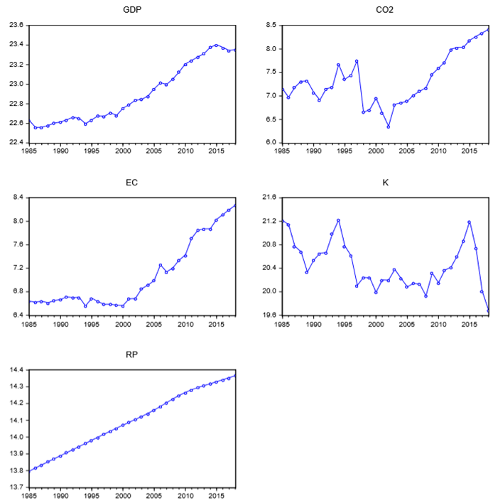 Data on economic development (GDP) and real gross-fixed-capital-formation (K) (both constant in 2010, US dollar), energy utilization (EC) (kt, of standard coal equivalent), rural population (RP) and CO2 (CO2) (kt) emissions were used. All data cover the period 1985-2018 are employed, using the natural logarithm and were extracted from U.S. Energy Information Administration (EIA) and World Bank. The capital stock data were not available to cover a long period in the context of the Republic of Congo. Thus, the change in gross-fixed-capital-formation has been considered as a reliable factor for capital stock, expecting a steady deterioration rate. Data on gross fixed capital formation in Congo are available only from 1985 to 2018. Earlier works (Nepal & Paija, 2019; Soytas & Sari, 2003; Zhang & Cheng, 2009) have also adopted gross fixed capital formation in their studies as a capital stock proxy. The urban population, total population, and labor force are variables often employed in the literature on the nexus between CO2 outflows, real GDP and, energy utilization (Chiou-Wei et al., 2008; Ugur, Sari, & Ewing, 2007; Zhang & Cheng, 2009). In spite of that, no previous research has employed a rural population in a study of the interaction between CO2 outflows, energy consumption and real GDP in the Republic of Congo context.