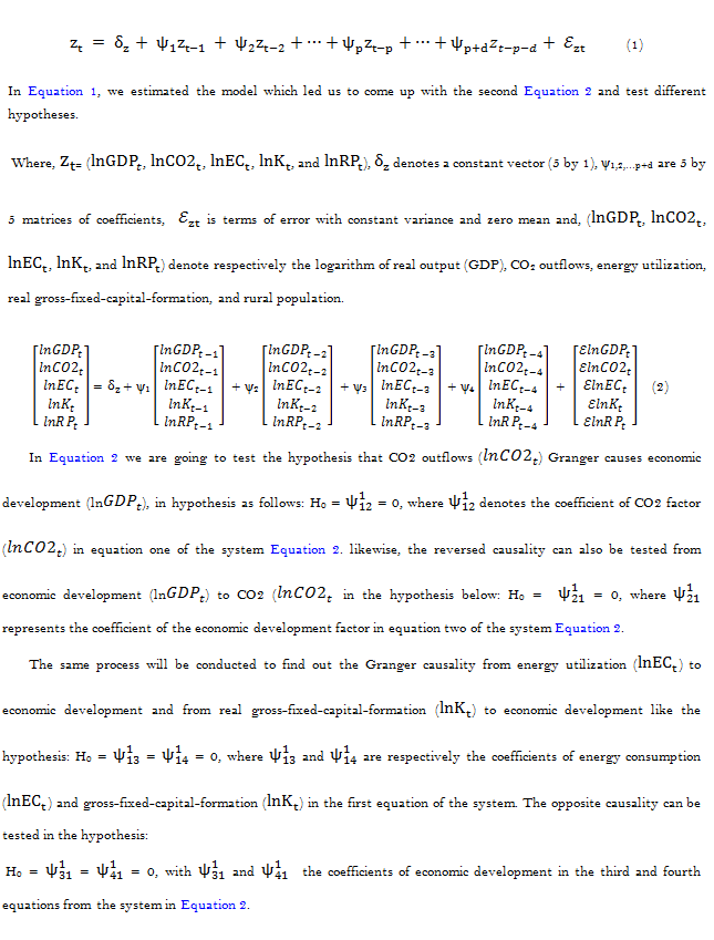 Finally, applying the Granger causality test for the same country, some authors have obtained divergent results because of the differences between study periods and the lack of consideration of certain political changes, economic conditions in these countries, the functional form, without calling into question the methodology as a whole. So, in their “study on CO2 emissions, economic growth, energy consumption, and foreign direct investment: causality analysis for sub-Saharan Africa”, Kivyiro and Arminen (2014) found a linkage from energy use to economic development in Republic of Congo, while (Odhiambo, 2010) identifies a link in the opposite direction. Similarly, for Kenya, Odhiambo (2010); Mensah (2014) indicated a link of energy utilization to economic development, while (Kivyiro & Arminen, 2014) showed no significant. For a study on a single country, Owusu (2018) focused his work on “Investigating the multivariate Granger causality between energy consumption, economic growth and CO2 emissions in Ghana” accounting for 1960 - 2015 and adopted Granger causality and cointegration techniques. The empirical analysis showed that series were cointegrated and causality between energy utilization and carbon dioxide (CO2) emissions were displayed. Similarly, Victor, Emir, and Sarkodie (2019) found a unidirectional causal from energy utilization to economic development on their work titled “Another look at the relationship between energy consumption, carbon dioxide emissions, and economic growth in South Africa”. The results also depicted an inverse link between energy utilization and economic development in a long - run and confirmed the hypothesis, energy - led - growth.