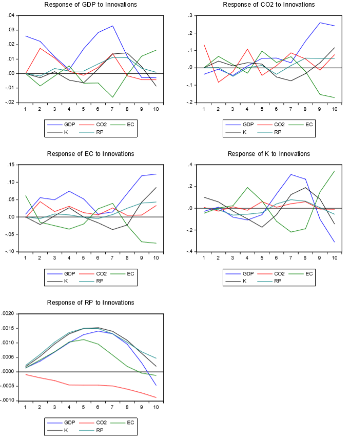 5.3. Generalized Impulse ResponseFigure-3. Generalized-impulse-response -of GDP, CO2, EC, K & RP to Innovation.