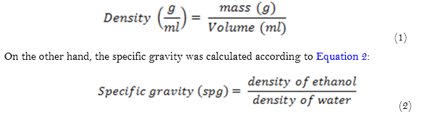 Densities of all produced ethanol samples were determined using hydrometer and mass per volume measurement as indicated in Equation 1.