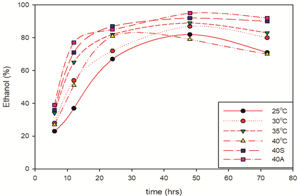 Figure-2. Fermentation time and Temperature as a function of ethanol yield. Note 40S and 40A are samples supplemented with sucrose and alpha amylase and operated at 40oC, respectively.
