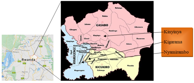 Kigali, the capital city of Rwanda, has three districts: Gasabo, Kicukiro, and Nyarugenge districts. Kinyinya sector is located in Gasabo district, Kigarama sector within Kicukiro district, and Nyamirambo sector in Nyarugenge district, these sectors were selected as the study area of present research. Figure 1 indicate locations of these sectors in map of Kigali city.