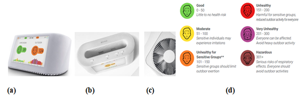 Figure-2. Air visual nodes used in data collection: (a) screen view of the node. (b) top view of the node with four navigating buttons. (c) Advanced laser particle sensor inside the node, which is capable of measuring the carbon dioxide and particulate matter concentrations and (d) Air Quality Index display on Node’s screen (color change according to the variation of the registered pollutant concentration levels from Good to Hazardous air).