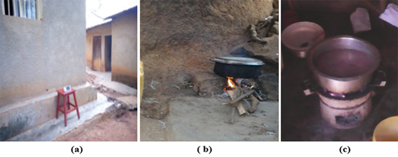 Figure-3. Field activities in houses using woods and Charcoals cooking: (a) Ambient air (Baseline) Measurements outside kitchen, (b) In kitchen woods were used for cooking (c) In kitchen where charcoals were used for cooking.