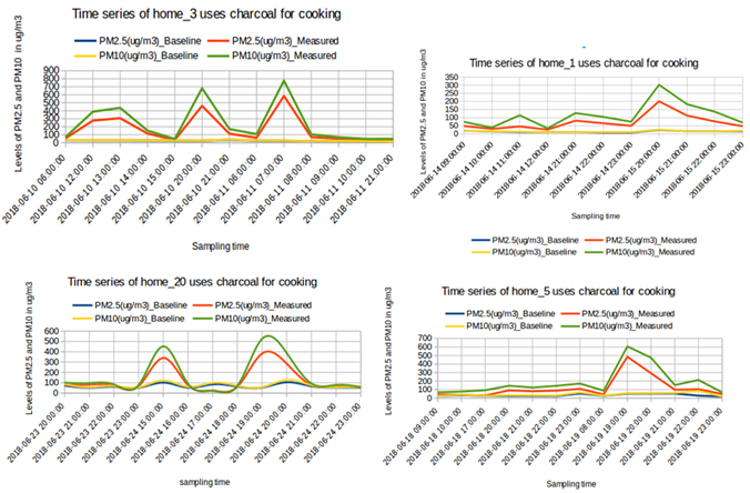 Figure-5. Time series indicating the variations of PM2.5 and PM10 concentration levels for homes 3, 1, 20, and 5 using charcoals for cooking activities.