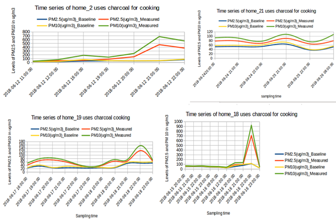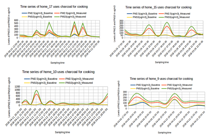 Figure-6. Time series indicating the variations of PM2.5 and PM10 concentration levels for homes 17, 15, 10, and 9 using charcoals for cooking activities.