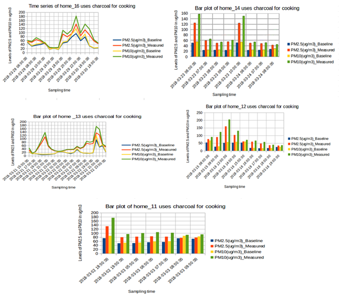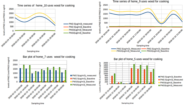 Figure-9. Time series and bar-plots indicating the variations of PM2.5 and PM10 concentration levels for homes 10, 9, 7, and 5 using woods for cooking activities.