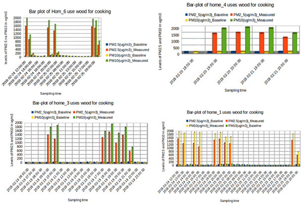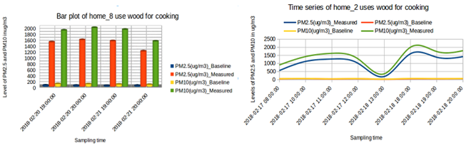 Figure-11. Bar-plots and time series indicating the variations of PM2.5 and PM10 concentration levels for homes 8 and 2 using woods for cooking activities.