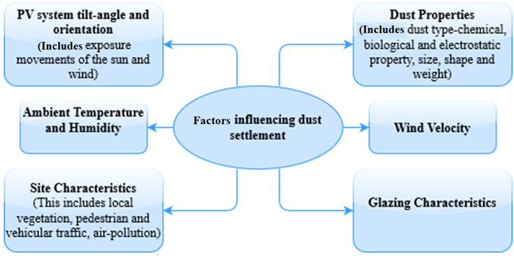 One of the environmental factors directly related to the deposition of dust on the surface of solar systems is the direction and speed of the wind. Low-speed winds usually cause dust to settle, while high-speed winds have a different effect, removing dust on the surface (Gupta, Sharma, Pachauri, & Babu, 2019). However, the geometry of the PV system is concerning . The direction of wind movement can increase or decrease the dust settling on the panel surface in certain places of the PV system. The dust dispersion due to wind movements and the PV system's location depends on the dust's characteristics. A framework for understanding the various factors governing sedimentation/dust absorption is shown in Figure 1 (Mani & Pillai, 2010). It is easy to recognize that the phenomenon of dust settlement in PV systems is extremely complex and challenging to practically handle/comprehend in terms of all factors that affect dust settlement.
