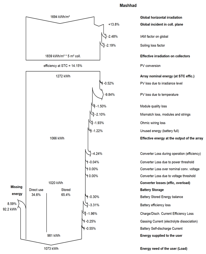PV array losses or collection losses (Lc) are mainly classified into heat absorption losses and miscellaneous losses. Heat loss is caused by increased cell temperature of more than 25 degrees Celsius. System wiring, module quality, mismatch, shadows, MPPT error, and soli are miscellaneous losses. The PV system losses of the simulated result for Mashhad is 18.9%. System losses (Ls): Inverters, incompetent battery systems, and inactive circuit elements cause losses for the system. The loss rate in the proposed system is 6.4%. The energy supplied to the user is 73.7%. According to the graph results, most of the panel losses are in summer and early autumn, the leading cause of which is dust settling on the surface of the panels. Fig 4 shows the system losses in different parts. The system's global horizontal irradiation (GHI) is 1694 Kwh/m2. The effective irradiance on the panels is1839 Kwh/m2. The energy need of the user is 1073KWh. PV loss due to temperature is -9.84%, and soiling loss factor is -2.19%. As mentioned in the previous sections, air temperature is one of the environmental factors affecting the performance of solar systems. Therefore, two factors, temperature, and dust, simultaneously affect the reduction of system efficiency.