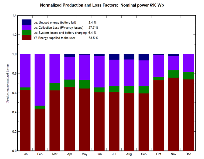 Abadan is one of the tropical regions in Iran and experiences several sand and dust storms annually. Due to the climatic conditions of this city, high temperature combined with dust affects the performance of solar systems and significantly reduces the output power. Figure 6. shows normalized production and loss factors. PV-array losses are 26.6%, and system losses are 5.9%. Most system losses occur from May to September because of the hot weather. For a year, different losses of the system for Abadan are seen in Figure 7. The GHI of the solar system is 1789 Kwh/m2. Also, the effective irradiance on the collectors is1745 Kwh/m2. The energy need of the user is 1073KWh. PV loss due to temperature is -13.09%, and soiling loss factor is -8.33%. Based on these results, it can be seen that the amount of losses due to temperature and dust greatly reduces the power and efficiency of the solar system. Therefore, using the solar system in this area is not efficient.