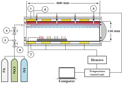 Figure 1. Experimental setup for torrefaction experiment using dry flue gas (DFG): (1) electric heaters (2) insulation (3) thermocouples (4) flowrate control valves (5) pressure gages (6) pressure control valve (7) biomass sample. |