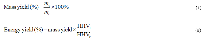 where mr is the mass of raw biomass and mt is the mass of torrefied biomass, while HHVr and HHVt are the higher heating values of raw and torrefied biomass, respectively.