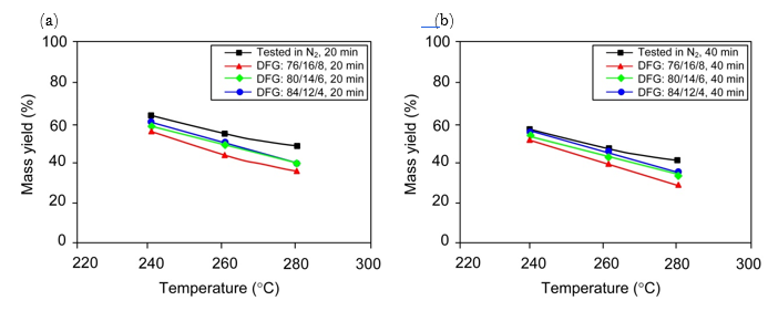 Figure 2. Effects of dry flue gas on mass yield of torrefied OPF tested at different temperatures for (a) 20 min and (b) 40 min. |