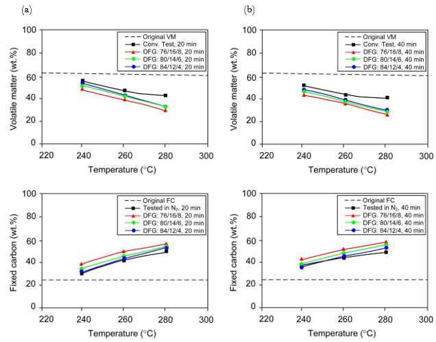 Figure 3. Effects of dry flue gas on the volatile matter (upper graphs) and fixed carbon (lower graphs) of torrefied OPF tested at different temperatures for (a) 20 min and (b) 40 min. |