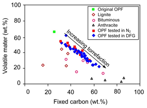 Figure 4 depicts the profiles of VM and FC of torrefied OPF using N2 and DFG. Note that the data for raw OPF and different types of coal (Miller, 2017) is also presented in Figure 4 for comparison. It is clearly demonstrated that when increasing the degree of torrefaction (i.e., increased temperature and time, CO2 and O2), VM exhibited a linear decrease with increasing FC. The values of VM and FC of torrefied OPF move towards the properties of lignite and bituminous coals. This means that torrefied biomass's fuel properties improved with increasing the degree of torrefaction.