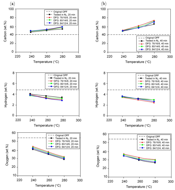 Figure 2 shows the effects of temperature, residence time, and composition of DFG on the mass yield of torrefied OPF. As shown, the temperature and reaction time exhibited important effects on the mass yield of treated OPF. During torrefaction in the specified operating conditions, the mass loss was predominantly attributed to evaporation of moisture and decomposition (devolatilization) of hemicellulose, light extractives, and some parts of cellulose and lignin (Haykiri-Acma et al., 2010; Ninduangdee & Kuprianov, 2014). An increased temperature and time led to a greater mass loss. This was mainly as a result of a higher degree of hemicellulose, cellulose, and lignin decompositions.