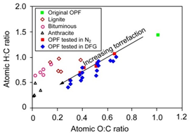 The van Krevelen diagram for OPF detailing the before and after torrefaction process using N2 and DFG is depicted in Figure 6. Note that the data for coals (Miller, 2017) is also plotted in Figure 6 for comparison.