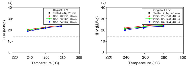 Figure 7. Effects of dry flue gas on the higher heating value of torrefied OPF tested at different temperature for (a) 20 min and (b) 40 min. |