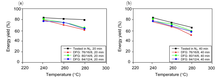 | Figure 8. Effects of dry flue gas on energy yield of torrefied OPF tested at different temperature for (a) 20 min and (b) 40 min. |
