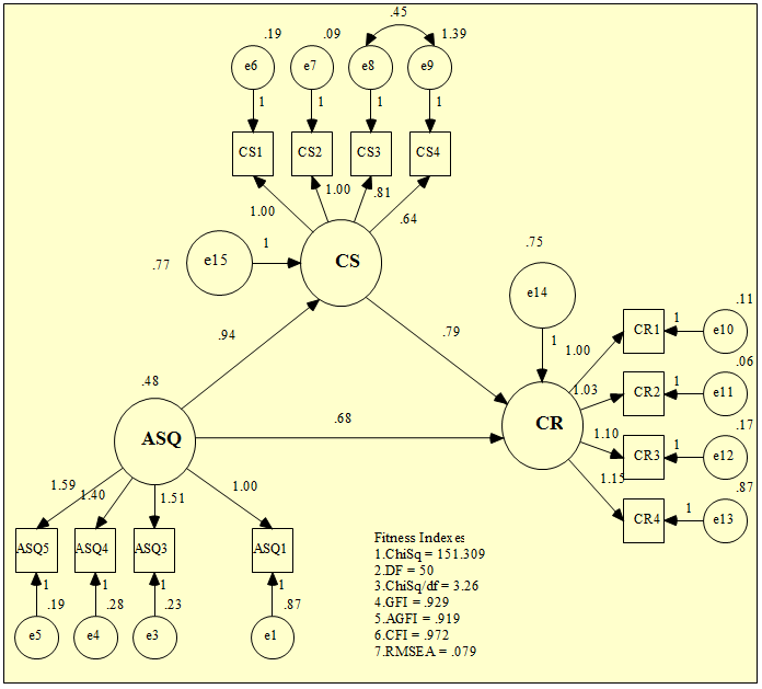 This study's main purpose is to use SEM to examine the effect of ASSQ on CS and CR. The confirmatory factor analysis (CFA), validity and reliability tests were performed before proceeding with the analysis using SEM to make sure that perhaps the data fulfilled the requirements for SEM analysis. A CFA was used to test the connections between the latent constructs (LC) (ASSQ, CS, CR) and the indices in a three-factor assessment.