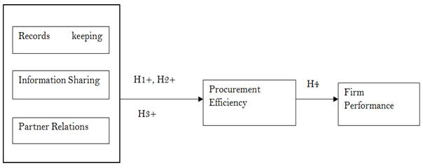 An efficiency procurement system contributes to firm performance in several ways. First, an efficiency procurement system eliminates waste and corruption in the procurement system. This reduces the firms cost of doing business. An efficiency procurement system also ensures that right quality materials are made available at every point in time to support the organisation’s operations. When the procurement system is efficient, records are collected, information is shared among vendors and buyers, and relationships management is given a high level of importance. The firm is able to benefit via cost reduction and quality improvement, as well as customer satisfactions from the ability to provide better service to customers (Flynn, 2018). It is therefore hypothesized that: