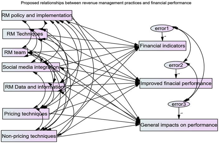 To summarize, implementing RM practices has a significant impact on hotel performance (Ortega, 2016). In Kenya, several star-rated hotels have been found to apply some RM techniques why others have not due to several internal and external factors associated with adoption and implementation (Murimi & Wadongo, 2021). However, it's critical to figure out the extent and the relationships between RM practices and the financial performance of hotels. The following Figure 1 displays the proposed relationships between various aspects of RM and the financial performance of hotels.Figure-1. SEM proposed relationships between RM practices on financial performance.