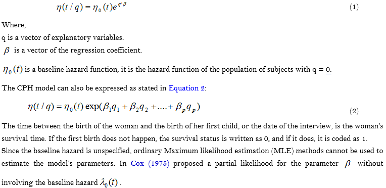 The CPH model (Cox, 1972) is used to investigate the relationship between a subject's survival time and one or more explanatory variables.