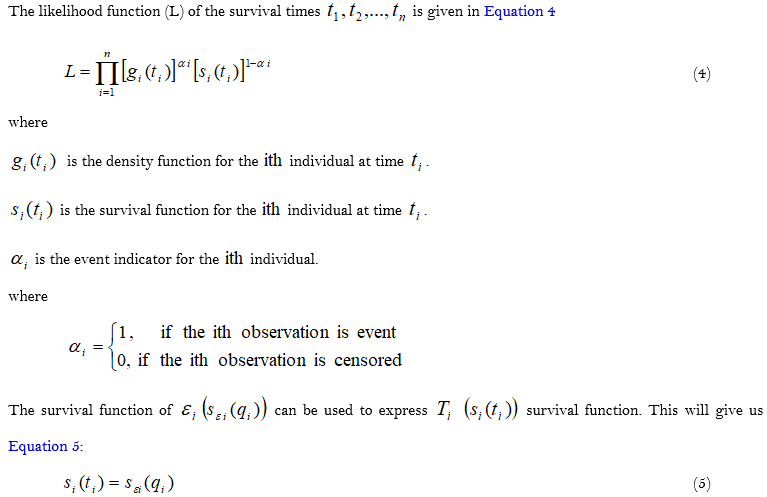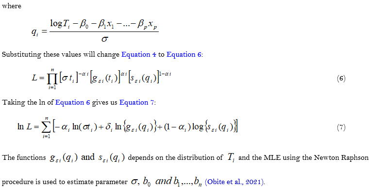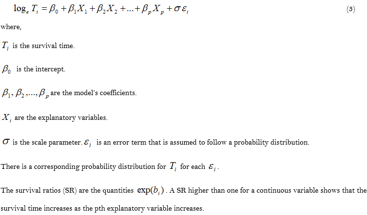 Survival data is also analyzed using the AFT model. The model measures the effect of covariate on survival time acceleration or deceleration. The AFT model's log-linear form in Equation 3 depicts the mathematical relationship between the set of variables and log of time, which is written as: