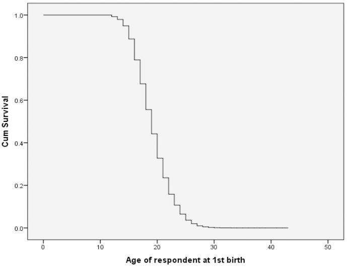 The women for this study are aged 15-49. The survival time is measured from the date of the woman’s birth, till the day of exposure to first birth. For those who have not experienced the event of interest at the date of the interview, the survival time is their current age.
